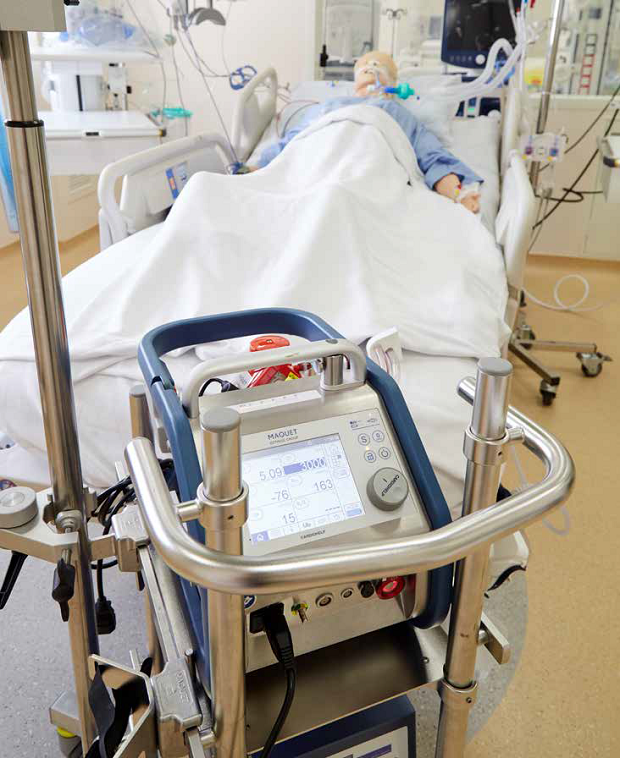 <<Dr Sewa Duu Wen (with Nurse Clinician Anwen Chan Shi) demonstrates on a mannequin the setting up of the ECMO machine, which takes over the functions of a patient’s lungs and heart to allow the infected lungs to recover.>>